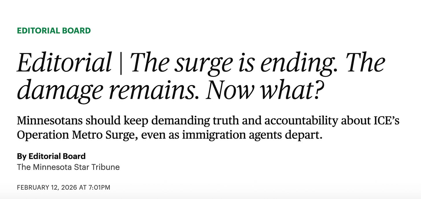 Trust in government — already fragile — has been further eroded. But trust can and must be rebuilt... Minnesotans should not cease demanding truth, accountability and reckoning equal to the damage done and lives lost by an ICE surge that never needed to happen.